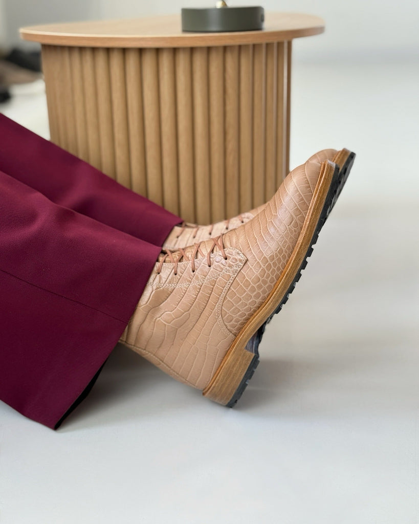 Lovidovi B3 Croco Boots zeichnen sich durch ein markantes Krokodilleder-Design, eine hochwertige Ledersohle und eine flexible Blake-Stitch-Konstruktion aus. Elegant und anspruchsvoll verkörpern diese Stiefel zeitlosen Stil und moderne Handwerkskunst und sind die perfekte Wahl sowohl für formelle Anlässe als auch für smarte Freizeitlooks.